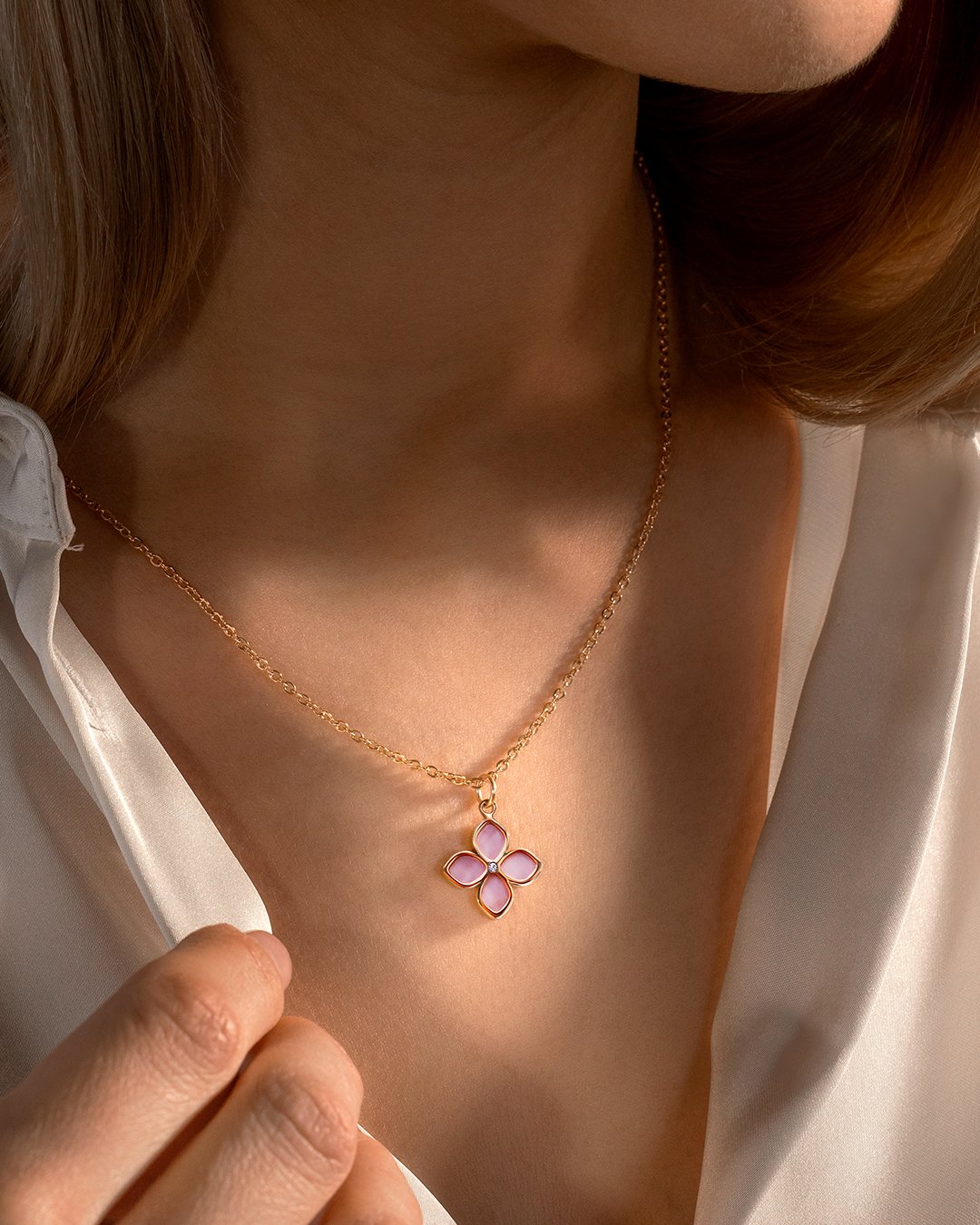 Der Anhänger Stellettio Rosa besteht aus einem Perlmuttstück, das von einem Motiv aus roséfarbenem Edelstahl mit einem Strassstein umhüllt ist.