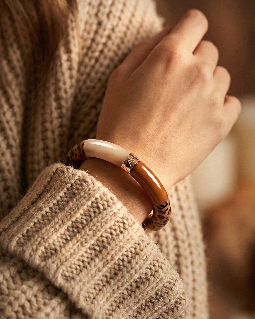 Das Armband besteht aus edlen Elementen in einer Farbe Beige marmoriert, Zweifarbiges Leopardenbraun, Braun marmoriert, Latte-Beige, Braun.