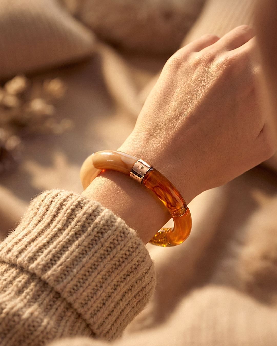 Lassen Sie sich von diesem handgefertigten Acetat-Armband verführen – Symbol für erschwinglichen Luxus und verantwortungsvolle Mode.
