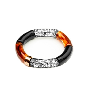 Das Armband besticht durch seine kontrastreiche Komposition: ein Element aus tiefschwarzem Acetat, das Tiefe verleiht, bernsteinorangefarbene Segmente mit warmen Reflexen, ein golden glitzerndes Detail, das das Ensemble erhellt, ein cremeweißes Element voller Sanftheit sowie ein Leopardenmuster in goldbraunen Nuancen, das Charakter und Raffinesse hinzufügt.