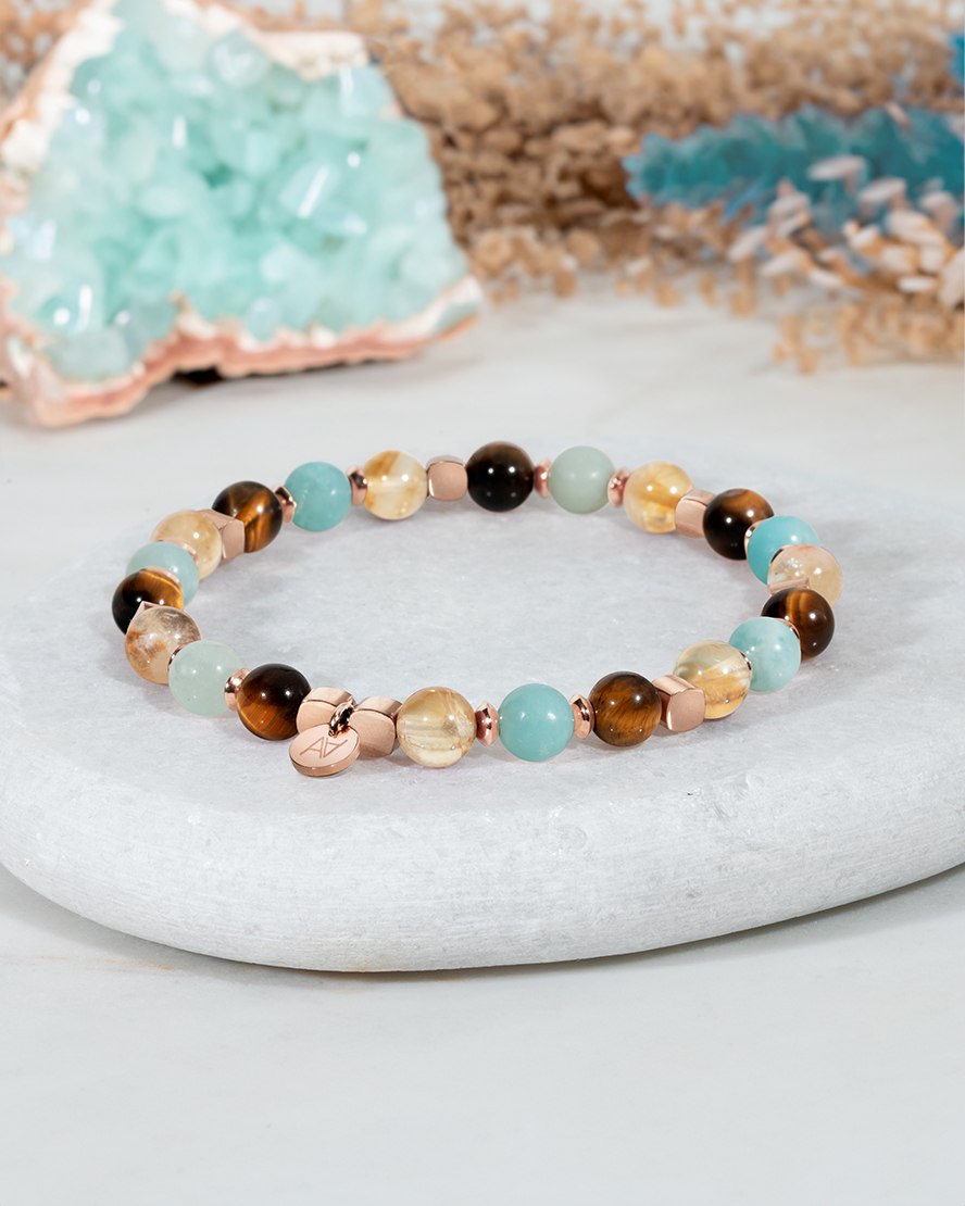 Die harmonische Kombination aus erwärmtem Citrin, Amazonit und Tigerauge steht für ausgeglichene Gefühle, starkes Selbstbewusstsein und sicheren spirituellen Schutz.