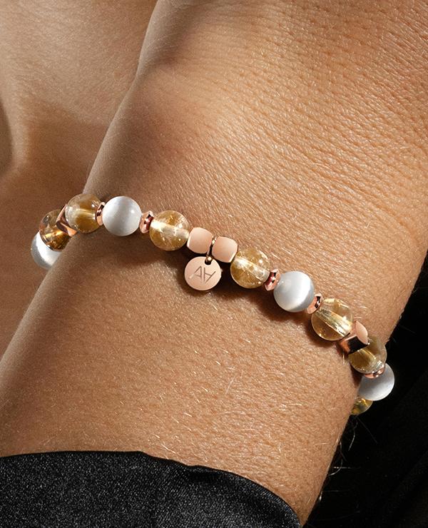 Der erhitzte Citrin, Symbol für Erfolg und Reichtum, verleiht einen sonnigen Glanz, der das Selbstvertrauen stärkt. Er lindert auch Stress, Angst und Depressionen und schenkt dem Träger Freude und Vitalität. Er entfaltet seine volle Kraft im Zusammenspiel mit dem Amazonit, einem Stein, dessen beruhigende und sanfte Wirkung legendär ist.