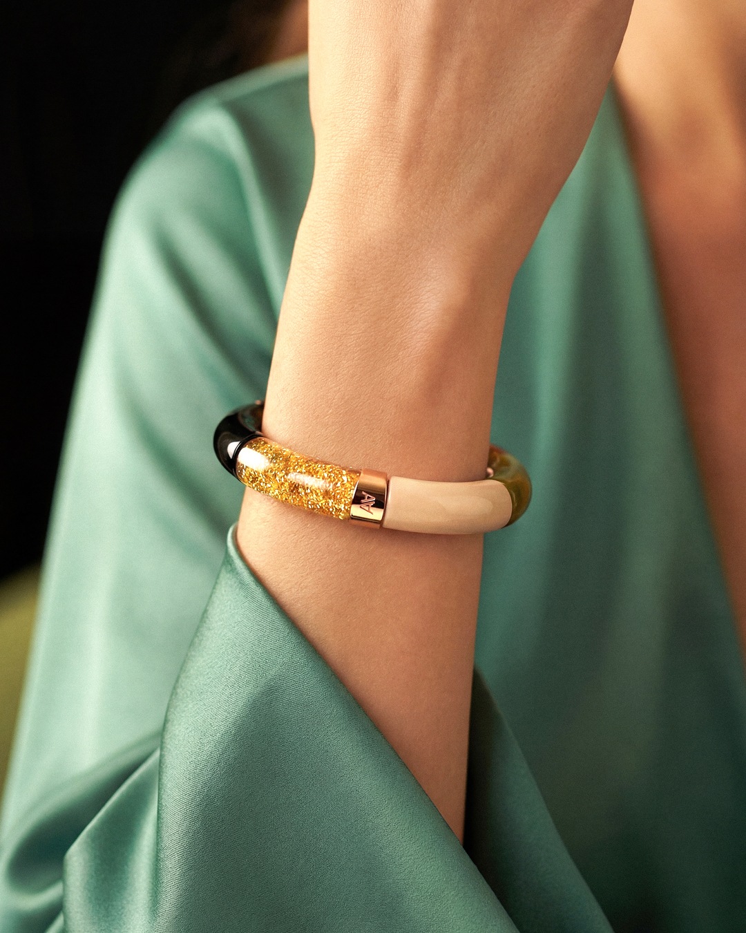 Lassen Sie sich von diesem handgefertigten Acetat-Armband verführen – Symbol für erschwinglichen Luxus und verantwortungsvolle Mode.