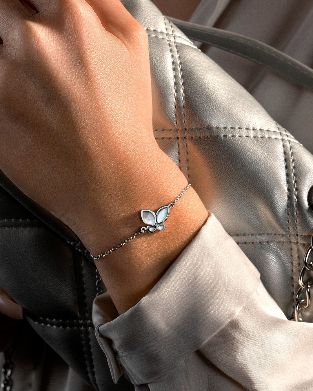 Das Armband Farfallatti besteht aus einem Perlmuttstück mit Strasssteinen und einer Kette aus Edelstahl.