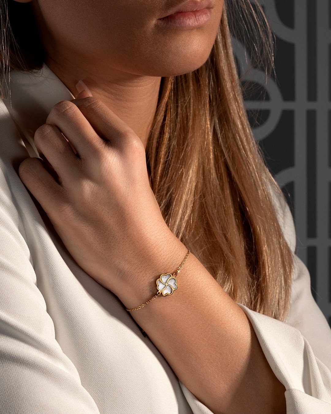 Das Armband Trifogletti Doro besteht aus einem Perlmuttstück, das von einer vergoldeten Kette aus Edelstahl begleitet wird.