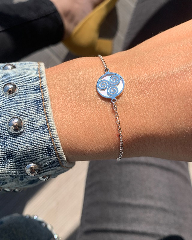 Das Armband Triskelo ist aus Edelstahl und mit einem Perlmutt verzierten Motiv versehen.