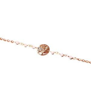 Das Armband Comito zeichnet sich durch eine elegante Kette aus, die mit sechs kleinen facettierten Rosenquarzsteinen verziert ist und ein Lebensbaum-Motiv in der Mitte hervorhebt.