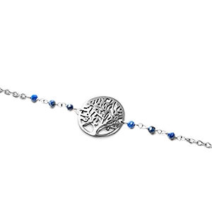 Das Armband Gimeti zeichnet sich durch eine elegante Kette aus, die mit sechs kleinen facettierten Lapislazuli-Steinen verziert ist und ein Lebensbaum-Motiv in der Mitte hervorhebt.