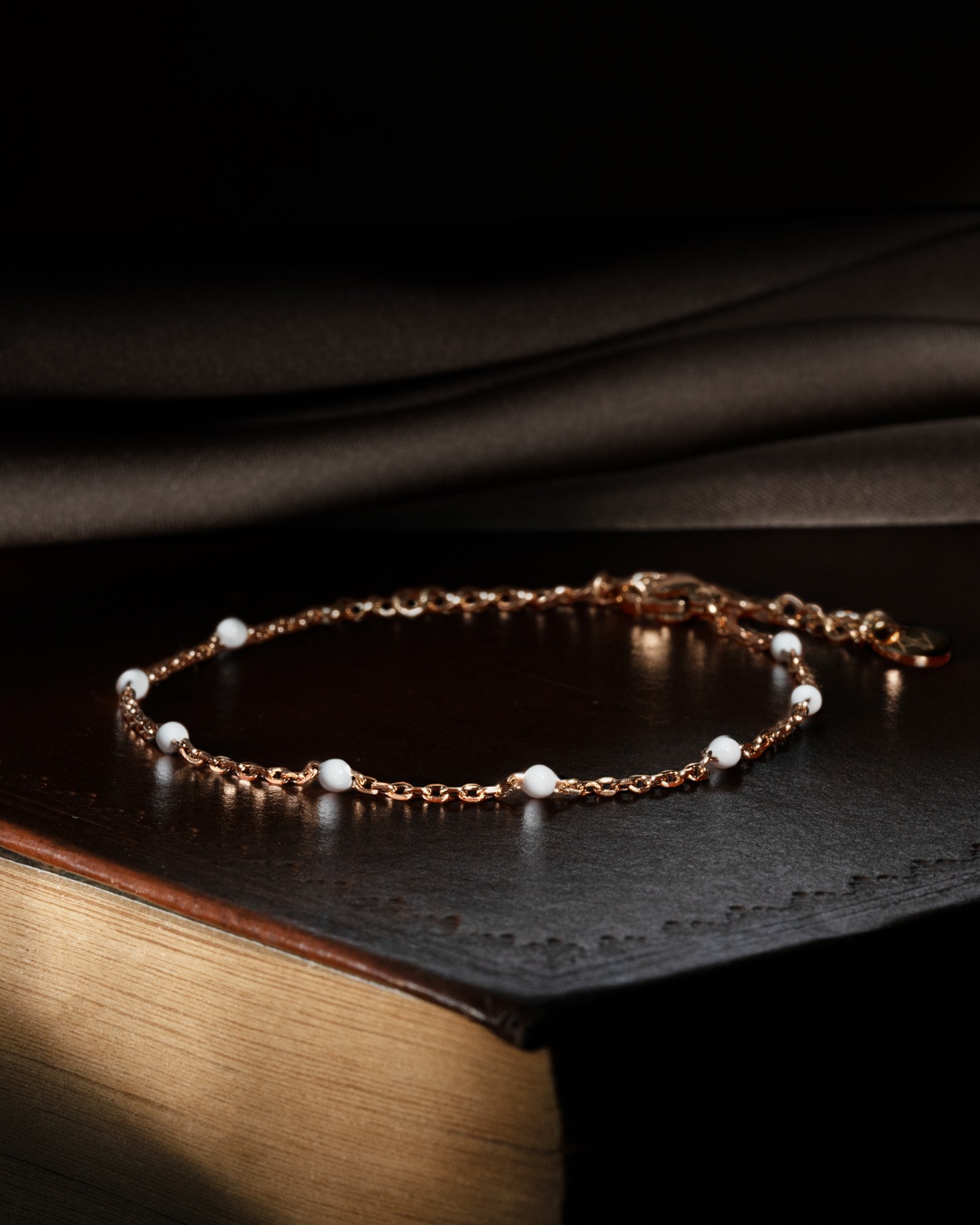 Das Armband Lena Rosa besteht aus einer Kette aus rosévergoldeten Edelstahl, die mit feinen Ornamenten aus weissem Emaille verziert ist. Das Armband hat eine Gesamtlänge von 21 cm und besteht aus einem Hauptteil von 14,5 cm sowie einem verstellbaren Teil von 6,5 cm, der an jedes Handgelenk passt. Dieses Armband ist ein unverzichtbares Accessoire, das perfekt zu den anderen Armbändern der Marke Anna Velazia anpasst.