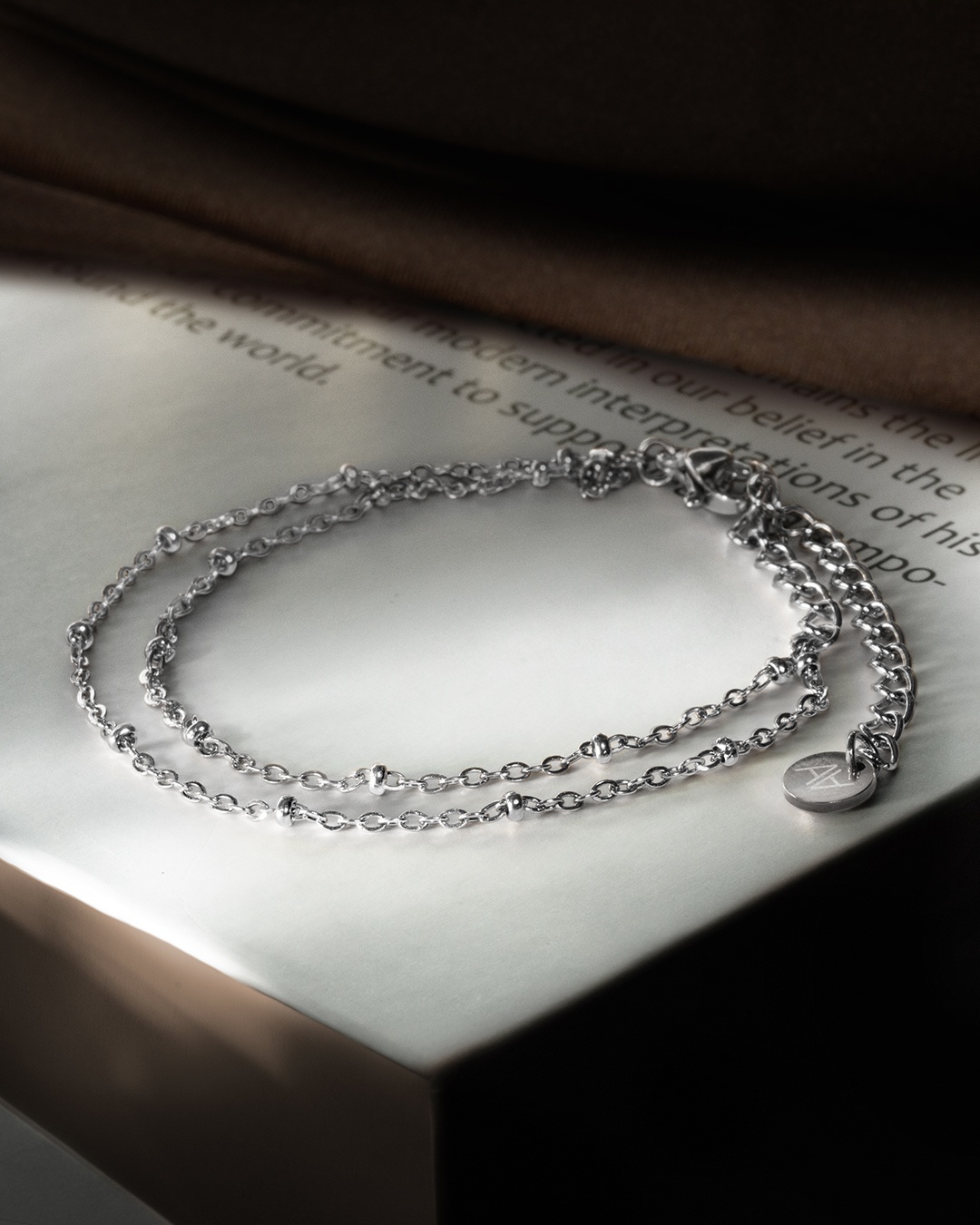 Das Armband Mayana ist ein doppelseitiges Armband, das mit kleinen Perlen aus Edelstahl verziert ist. Das Armband hat eine Gesamtlänge von 21 cm und besteht aus einem 14,5 cm langen Hauptteil sowie einem 6,5 cm langen verstellbaren Teil, der sich an jedes Handgelenk anpassen lässt. Das Armband ist ein unverzichtbares Accessoire, das perfekt zu anderen Armbändern der Marke Anna Velazia passt.