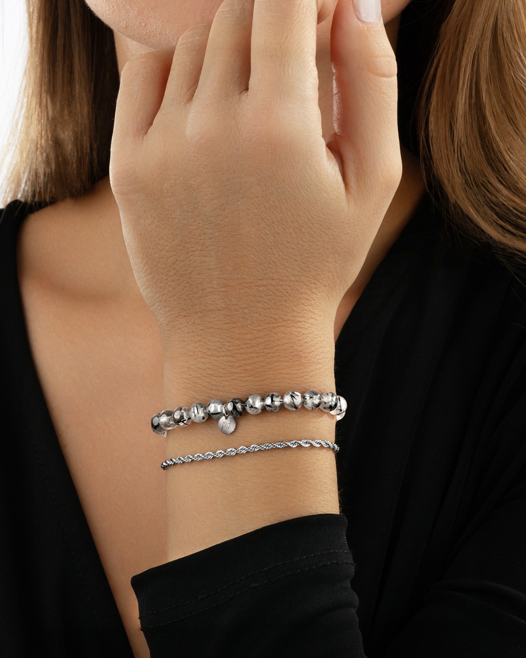 Das Armband Mia ist mit einer zart gedrehten Kette aus Edelstahl versehen. Das Armband hat eine Gesamtlänge von 21 cm und besteht aus einem Hauptteil von 14,5 cm sowie einem verstellbaren Teil von 6,5 cm, der sich an jedes Handgelenk anpasst. Dieses Armband ist ein unverzichtbares Accessoire, das perfekt zu den anderen Armbändern der Marke Anna Velazia passt.