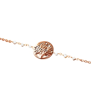 Das Armband Milati zeichnet sich durch eine elegante Kette aus, die mit sechs kleinen facettierten Mondsteinen verziert ist und ein Lebensbaum-Motiv in der Mitte hervorhebt.