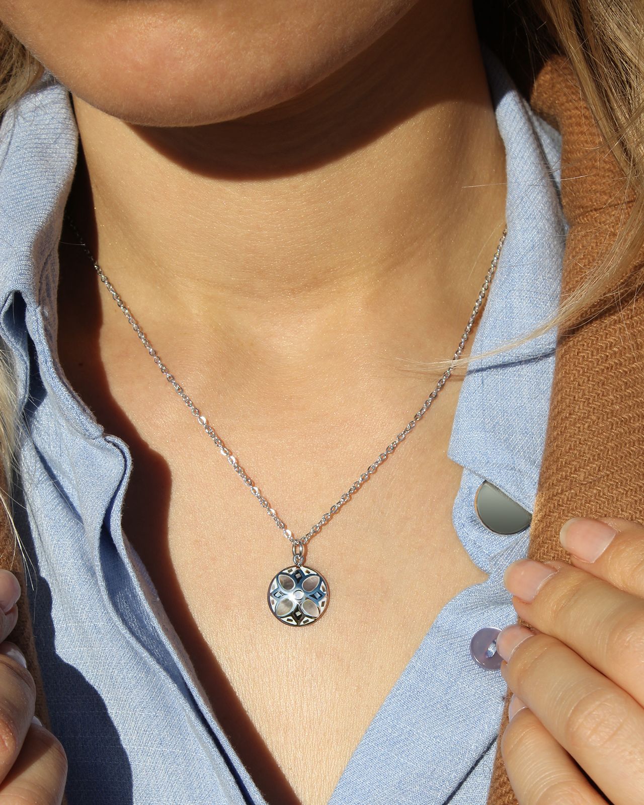Das einzigartige Design und die perfekte Symmetrie seiner Linien machen dieses Medaillon zu einem außergewöhnlichen Schmuckstück. Seine perlmuttfarbenen Blütenblätter und seine Farbe bieten die perfekte Balance für ein einzigartiges Ergebnis.