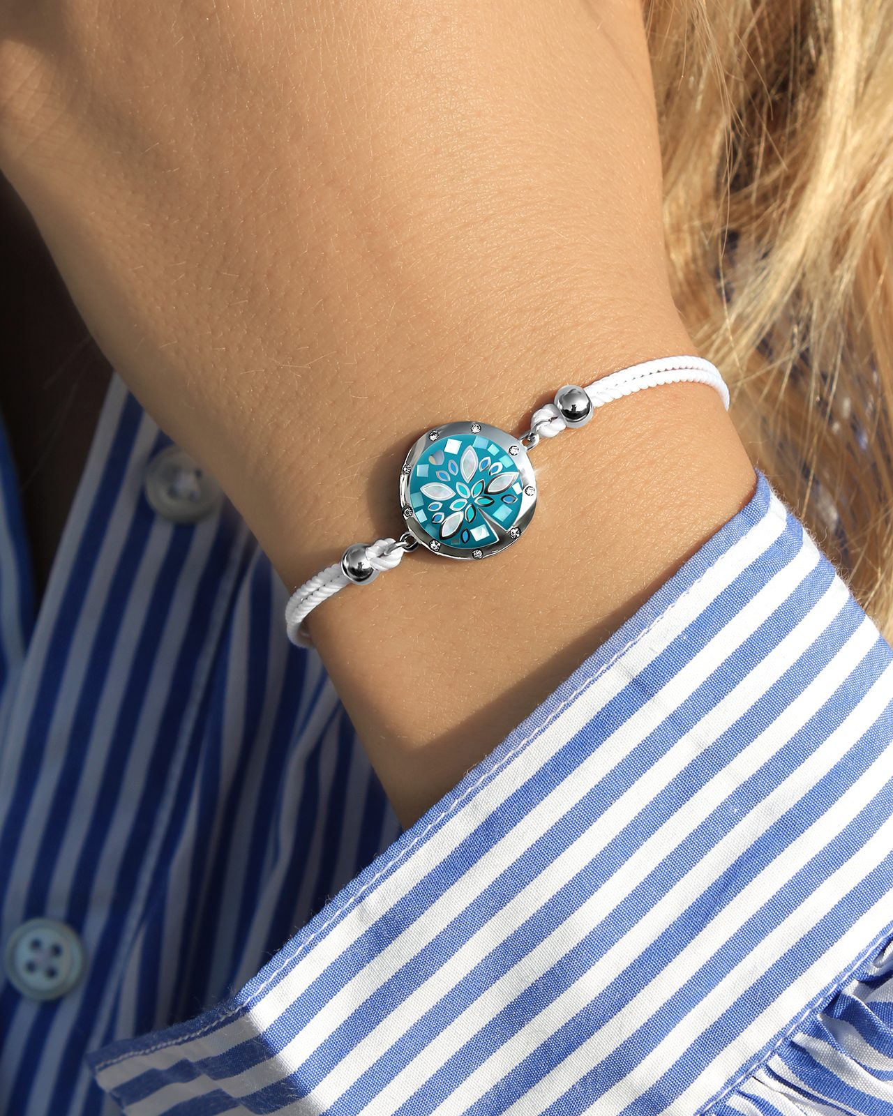 Die weiße Farbe seines feinen Baumwoll-Armbandes verleihen seinem Motiv eine gewisse Leichtigkeit, wodurch Sie es