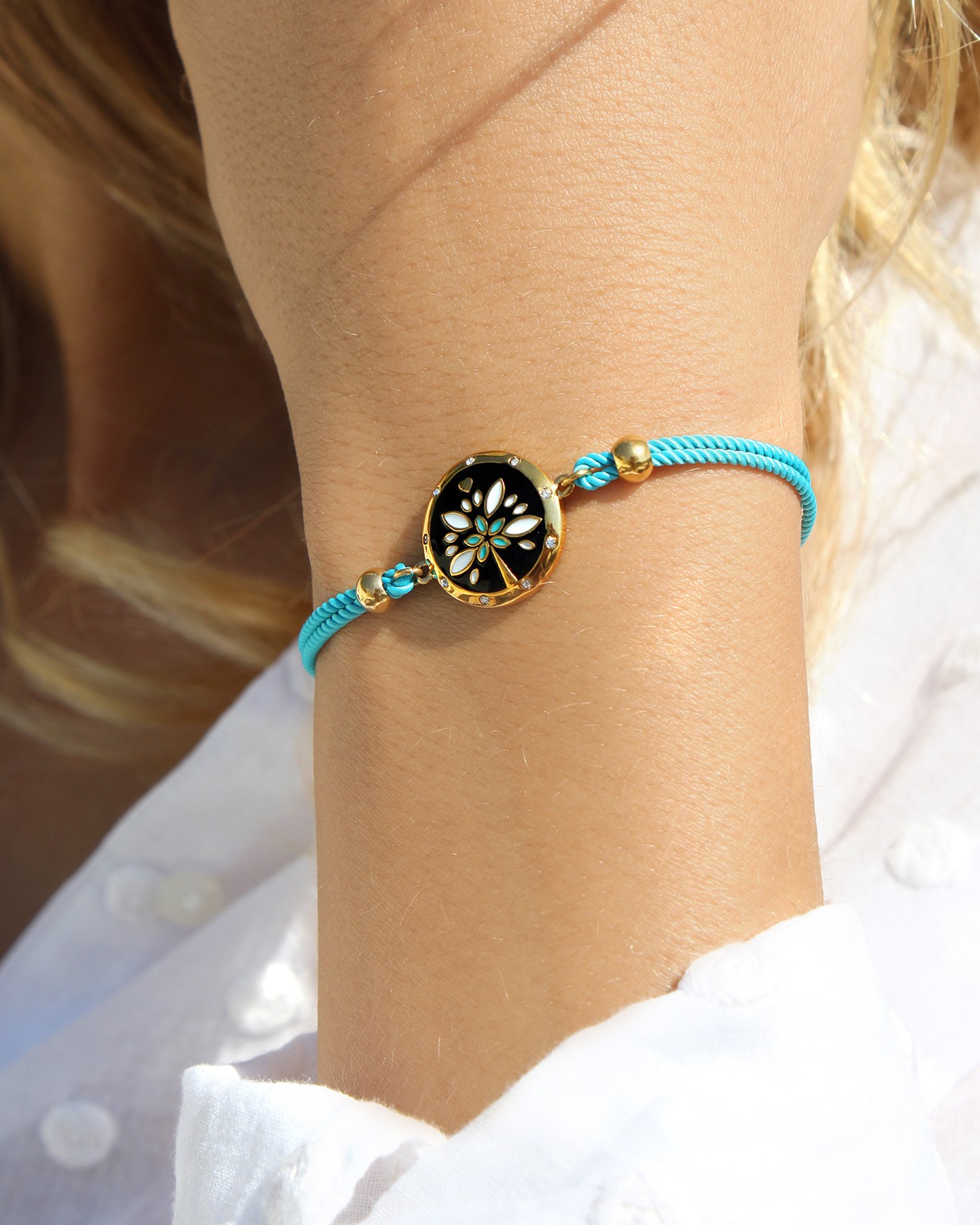 Das türkis-blaue Armband unterstreicht das goldene Edelstahl dieses Schmuckstück und macht es damit zu einem