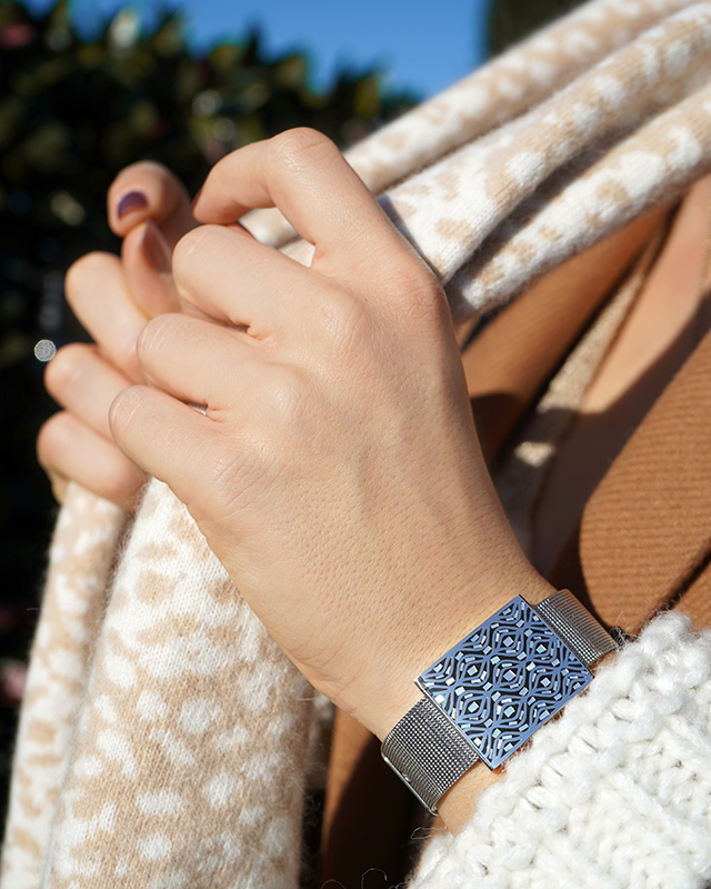 Das Milanaise Armband sorgt für die Harmonie, indem es dezent den Motiven der Metallschnalle entgegenwirkt.