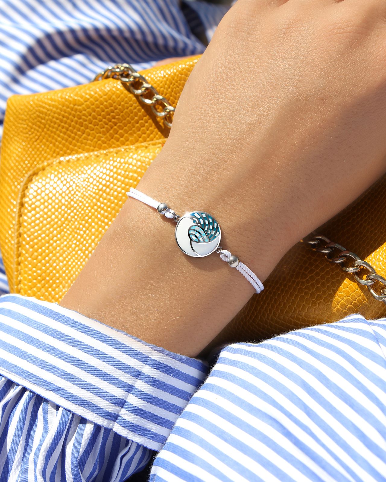 Die zart-weiße Farbe seines Baumwoll-Armbands begleitet Ihr Outfit mit Raffinesse und Eleganz.