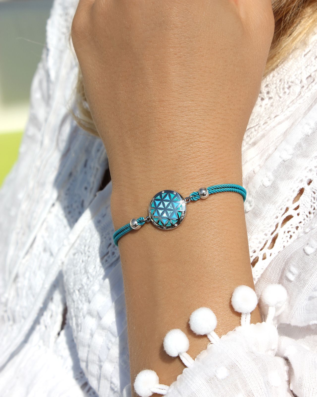 Das türkisblaue Baumwoll-Armband betont sanft dieses bedeutungsvolle Schmuckstück.