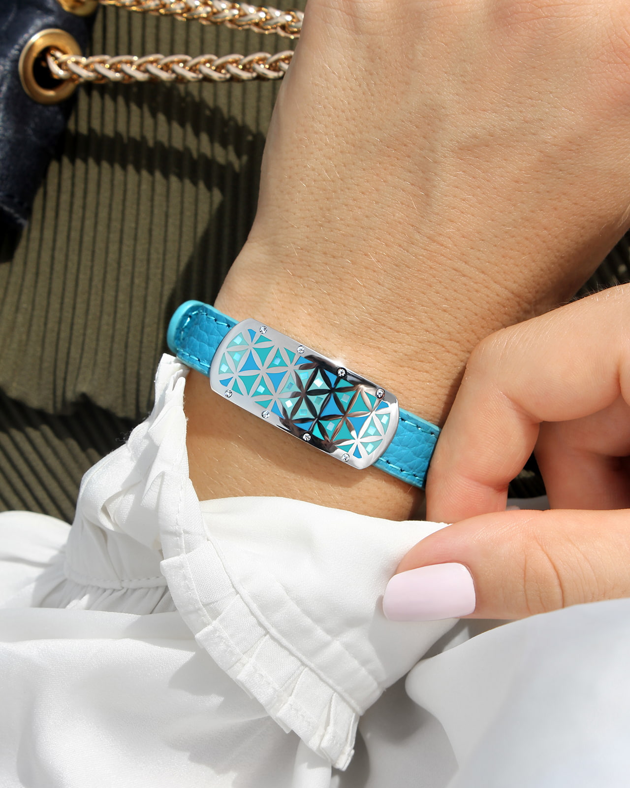 Das türkisblaue Armband aus Leder verleiht diesem bedeutungsvollen Stück eine besondere Note. Es wird Ihr Handgelenk mit Raffinesse zum Strahlen bringen.