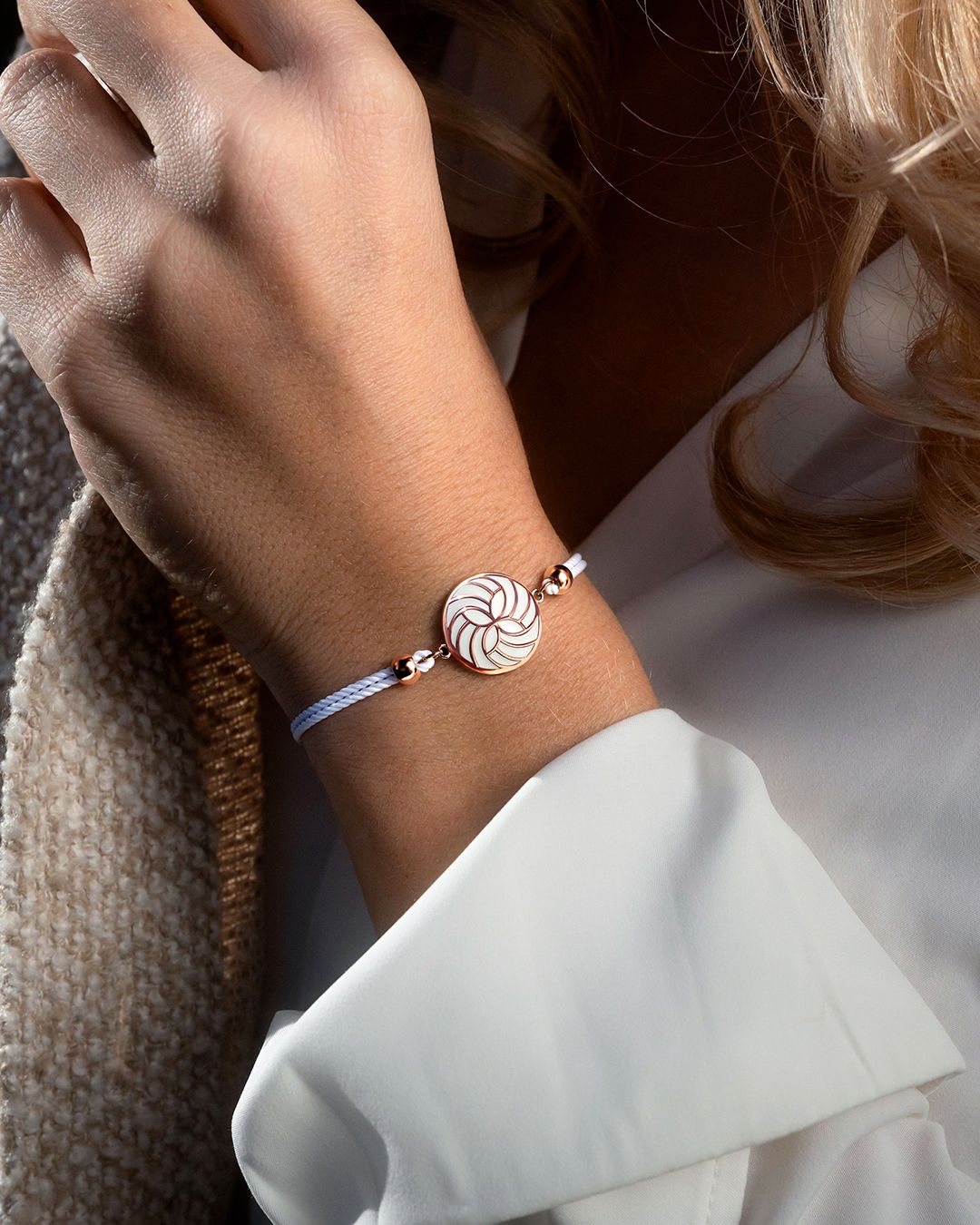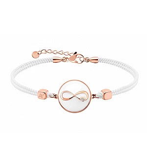 Das weiße Baumwoll-Armband verleiht diesem Schmuckstück Raffinesse und macht es einzigartig.