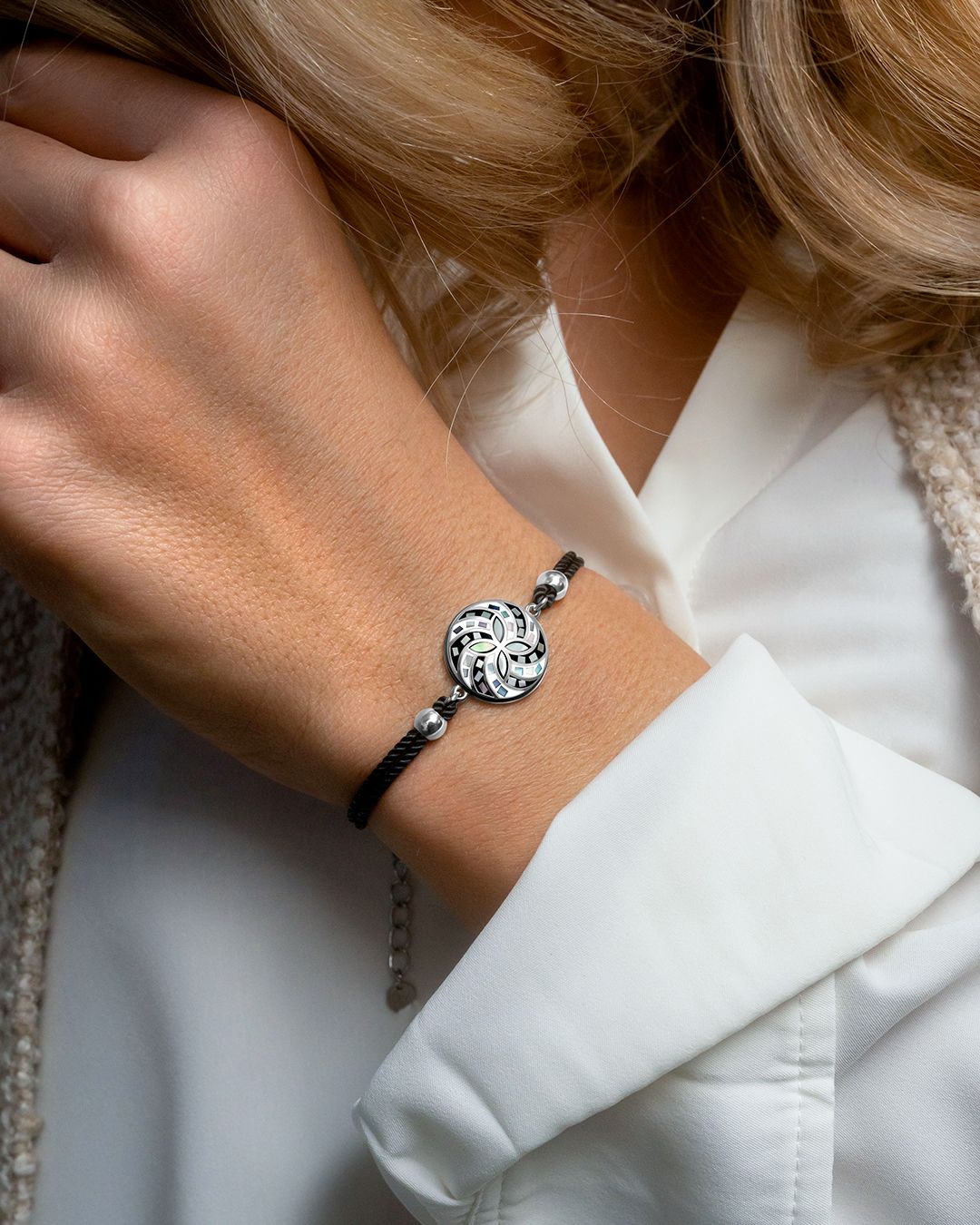 Die Farbe des Edelstahls hebt das schwarz-weiße Mosaik hervor, das mit feinen, schillernden Perlmutt Blättern verziert ist, die Ihren Outfits eine besondere Ausstrahlung verleihen werden!