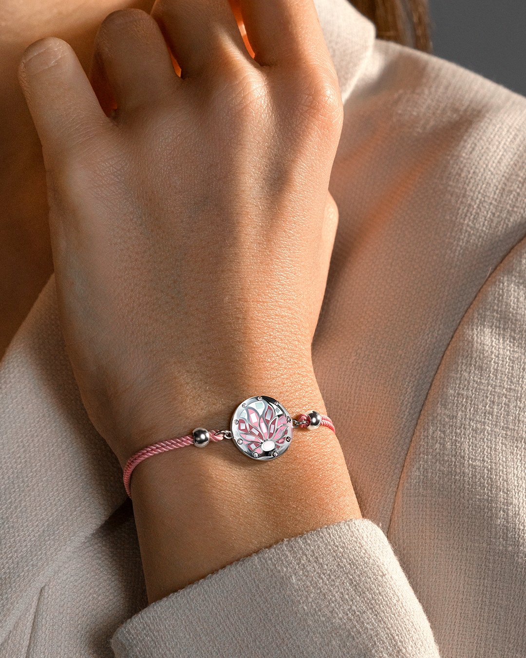 Die hellrosa Farbe des Baumwollarmbands wird Ihre Outfits elegant kleiden und macht es zum unverzichtbaren Accessoire für Ihren Look!