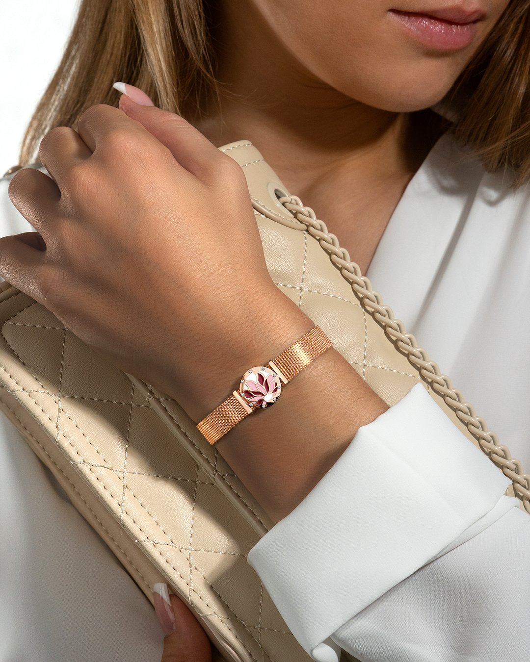 - Material des Armbandes Rosefarbenes Milanaise Metallgeflechte