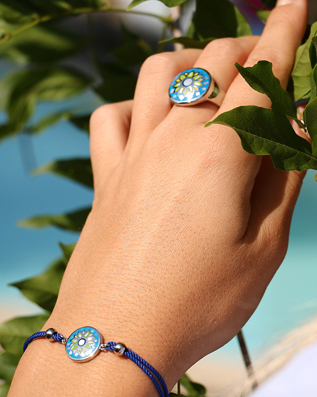 Kombiniert mit dem Pianosetta Ring wird dieses kleine Armband mit seinen kräftigen türkisfarbenen Blautönen Ihren Stil charmant betonen.