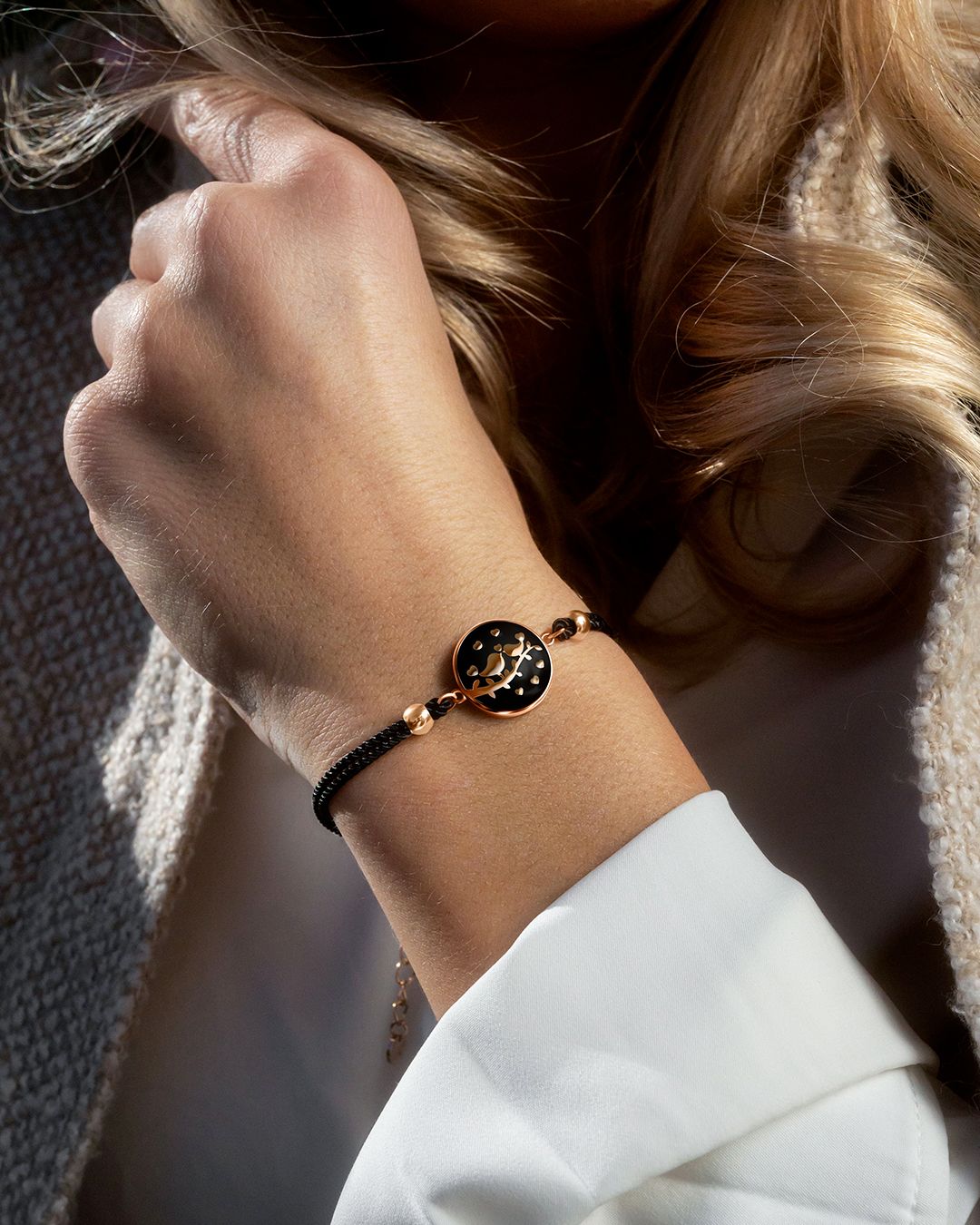 Die intensive schwarze Farbe seines Baumwoll Armbands hebt elegant das Emaille dieses Schmuckstücks hervor. Es wird sich perfekt an jedes Ihrer Outfits anpassen.