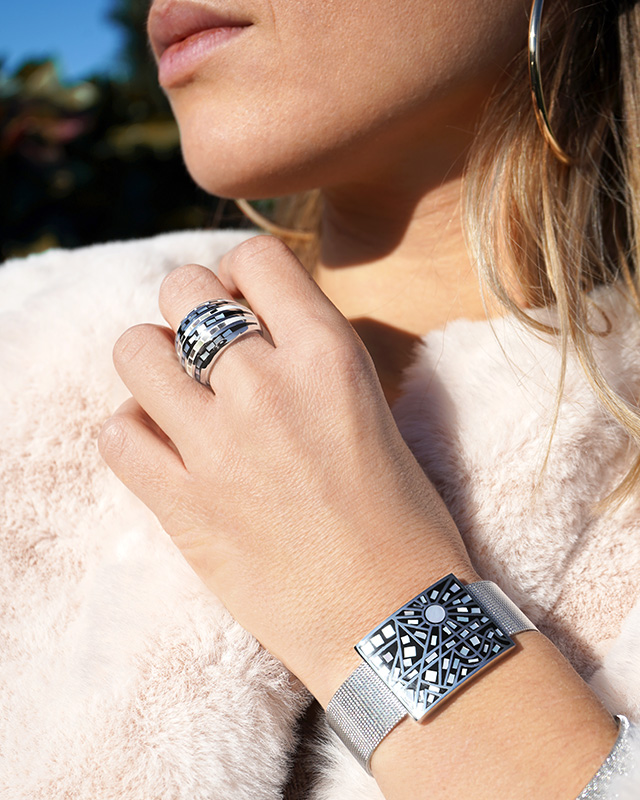 Ein Armband, das mit seinen kleinen perlmuttfarbenen Spitzen, die sein Mosaik beleuchten, Raffinesse und Eleganz vereint.