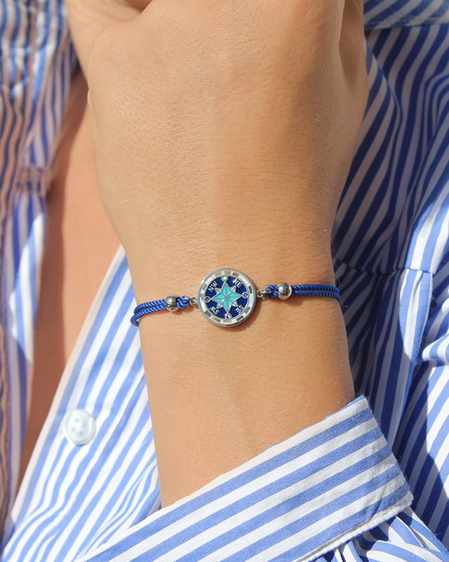 Das intensive Blau seines Baumwoll-Armbands harmoniert perfekt mit dem Edelstahl dieses Schmuckstücks