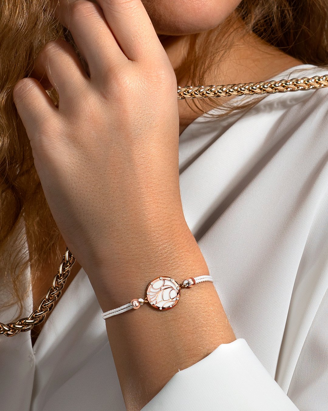 Die weiße Farbe des Baumwollarmbandes verstärkt die Intensität der goldenen Farbe, die durch die Reflexionen der Sonnenstrahlen funkelt.
