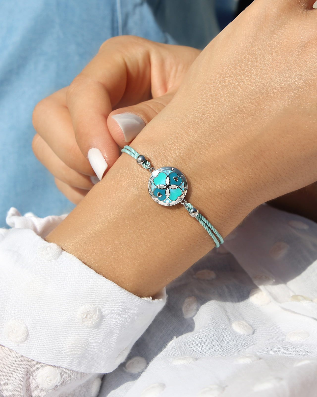 Das blaue-graue Baumwoll-Armband harmonisiert perfekt mit der Raffinesse seines Schmuckstücks.