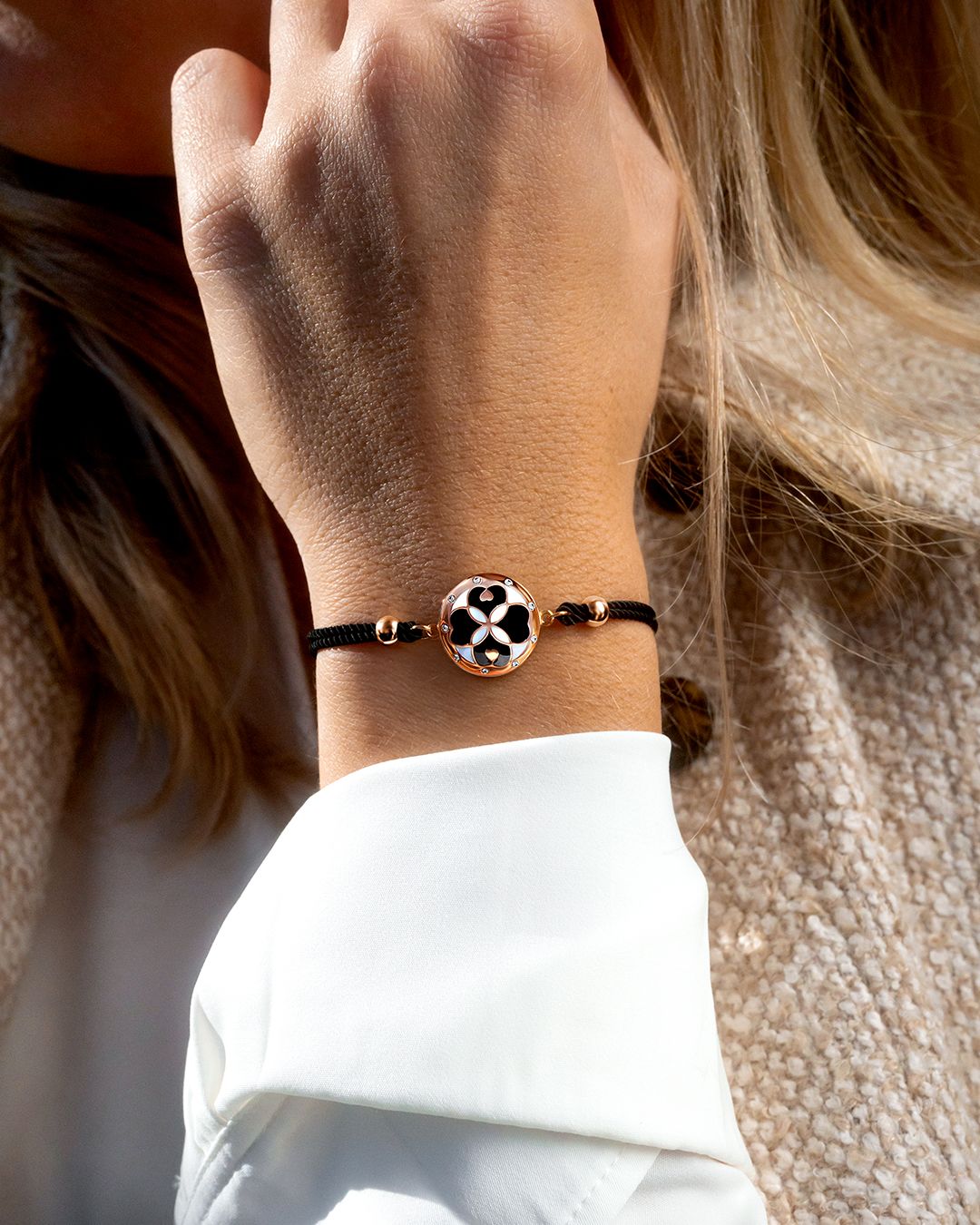 Die intensive schwarze Farbe seines Baumwoll-Armbands hebt elegant die Besonderheiten des Medaillons hervor und wird alle Ihre Outfits betonen.