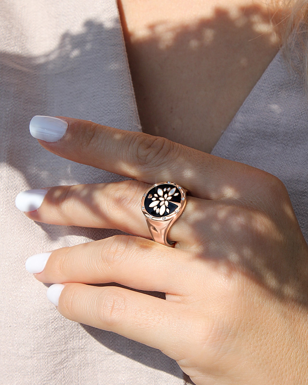 Die Form des Siegelrings passt perfekt zu seinem Motiv, das durch die Assoziation von intensivem Schwarz und dem Roségold der Fassung kontrastiert wird.