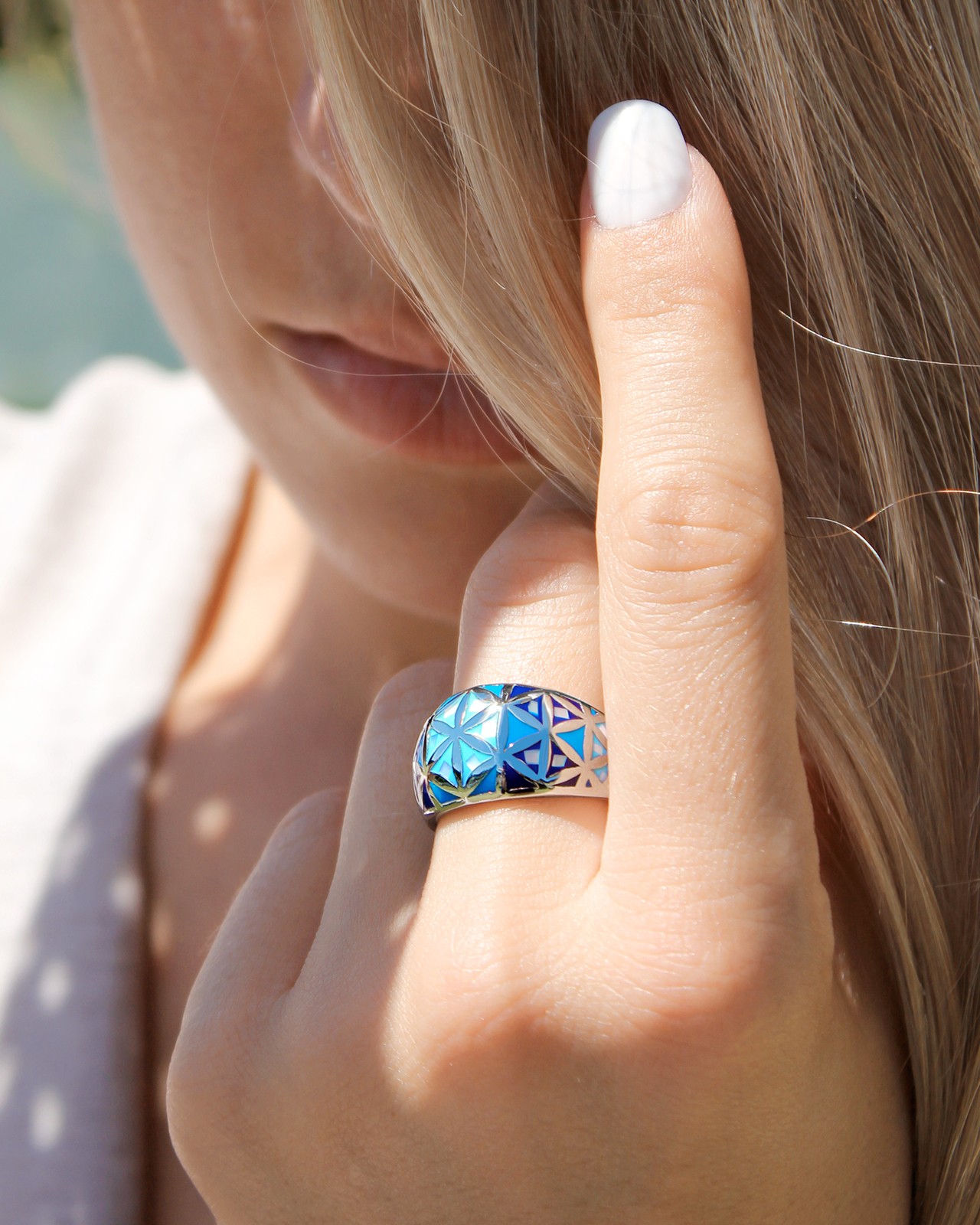 Die Blume des Lebens steht für den Prozess der immerwährenden Erneuerung des Lebens. Es ist eine der heiligsten geometrischen Formen der Welt. Jemandem eine Blume des Lebens zu schenken, ist daher wie das gesamte Universum in einem Schmuckstück zu verschenken.