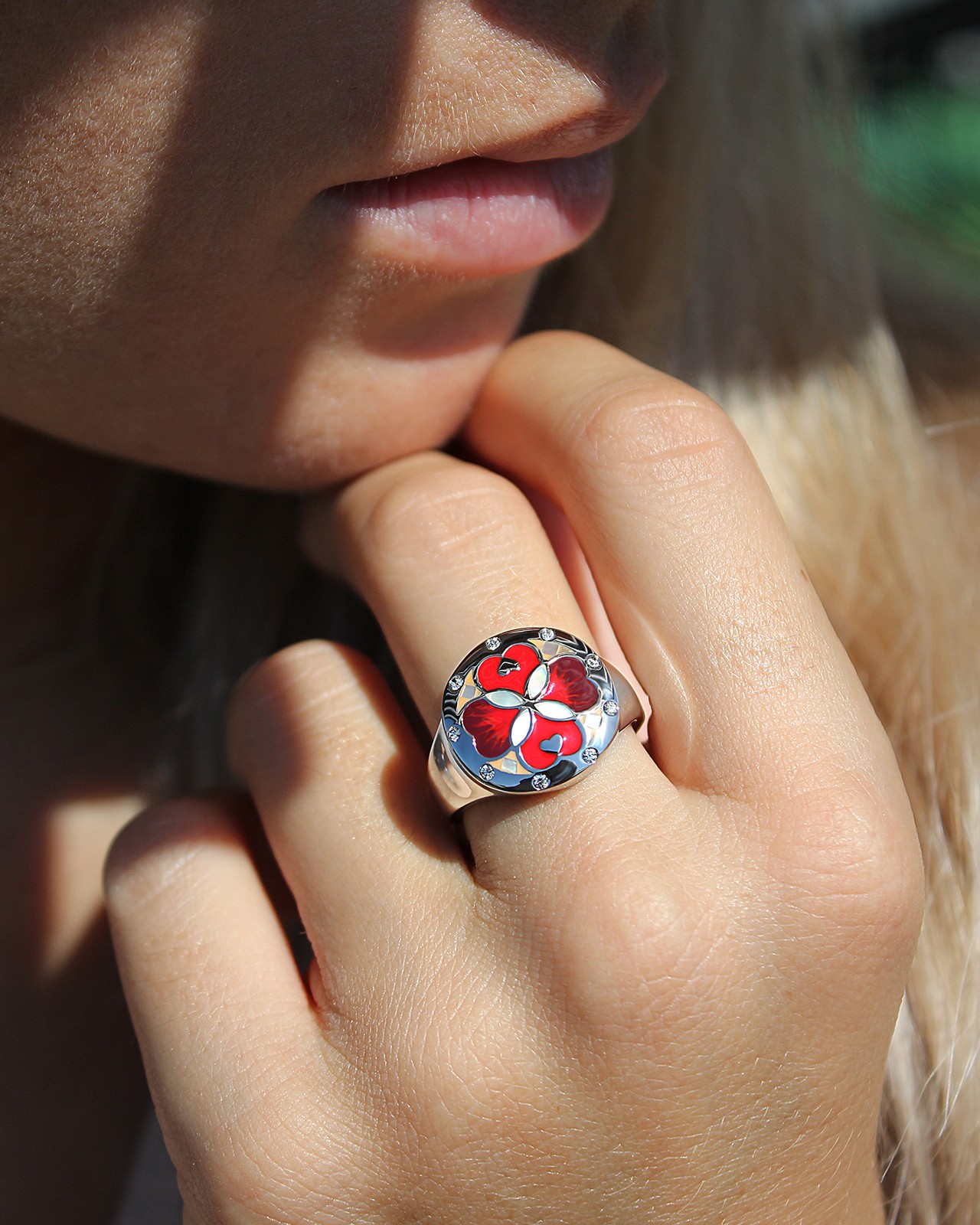 Seine Siegelringform bringt das rot schattierte Design elegant zur Geltung und verleiht Ihrer Hand einen Hauch von Brillanz.