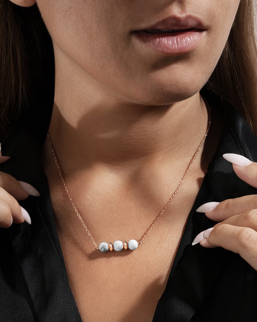 Der Anhänger Alcamina besteht aus 3 wunderschönen Howlith Natursteinen, die sorgfältig zwischen zwei Pastillen aus roséfarbenen Edelstahl