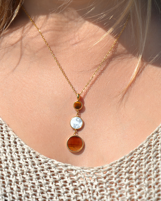 Der Anhänger Levolinio ist aus vergoldetem Edelstahl und einem Trio aus Steinen, zwei Tiger Augen und einem weißen Howlite, besetzt.