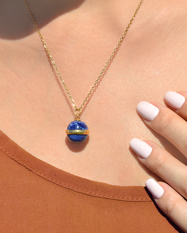 Der Anhänger Lionio und seine goldene Umrandung passen sich perfekt an seinen Sodalith an, der durch Lichtreflexionen sein ägyptisches Blau zum Vorschein kommen lässt.