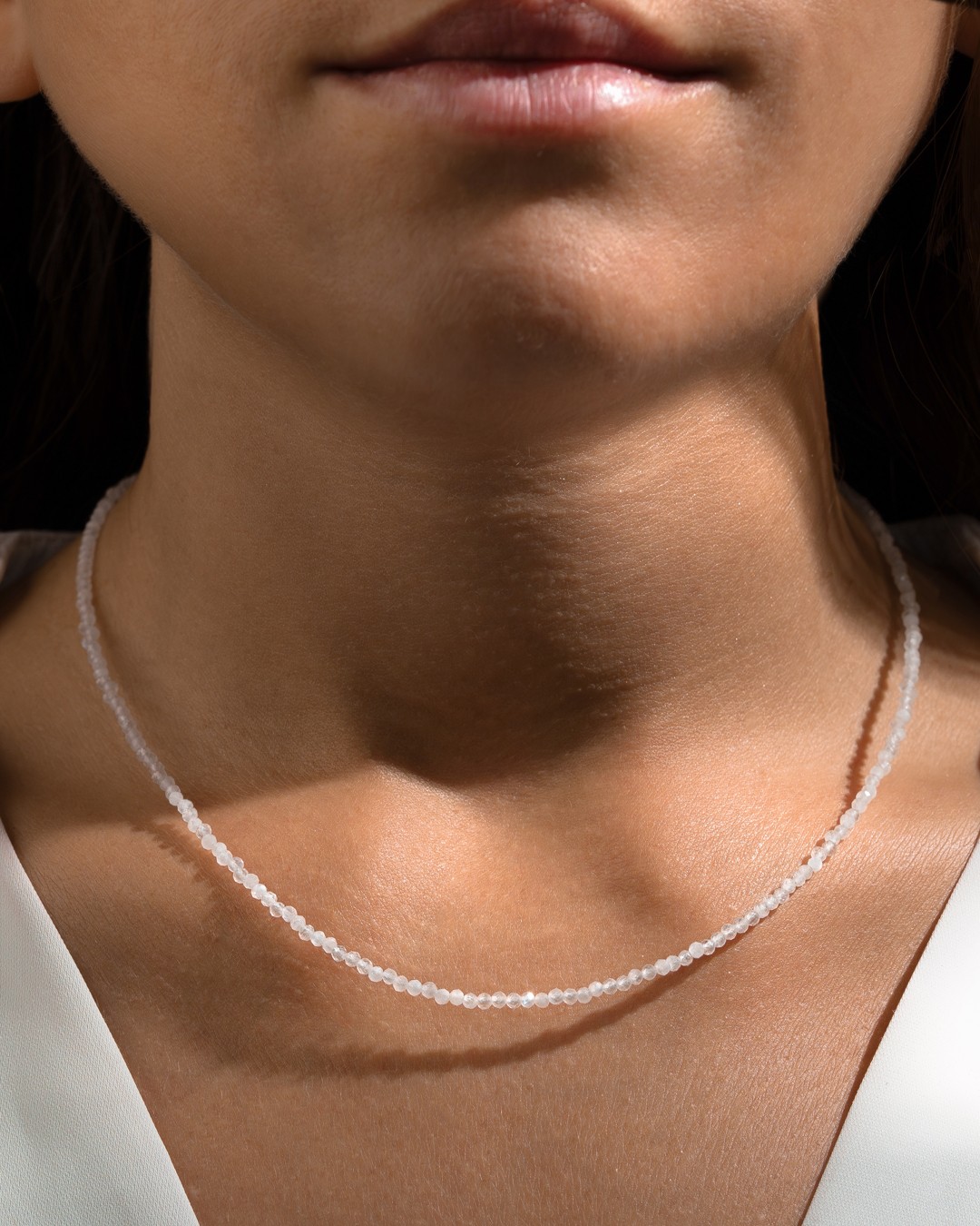 Die Halskette Milla hebt ein zartes Choker-Design hervor, das aus feinen facettierten Mondstein-Perlen von 2 mm besteht.