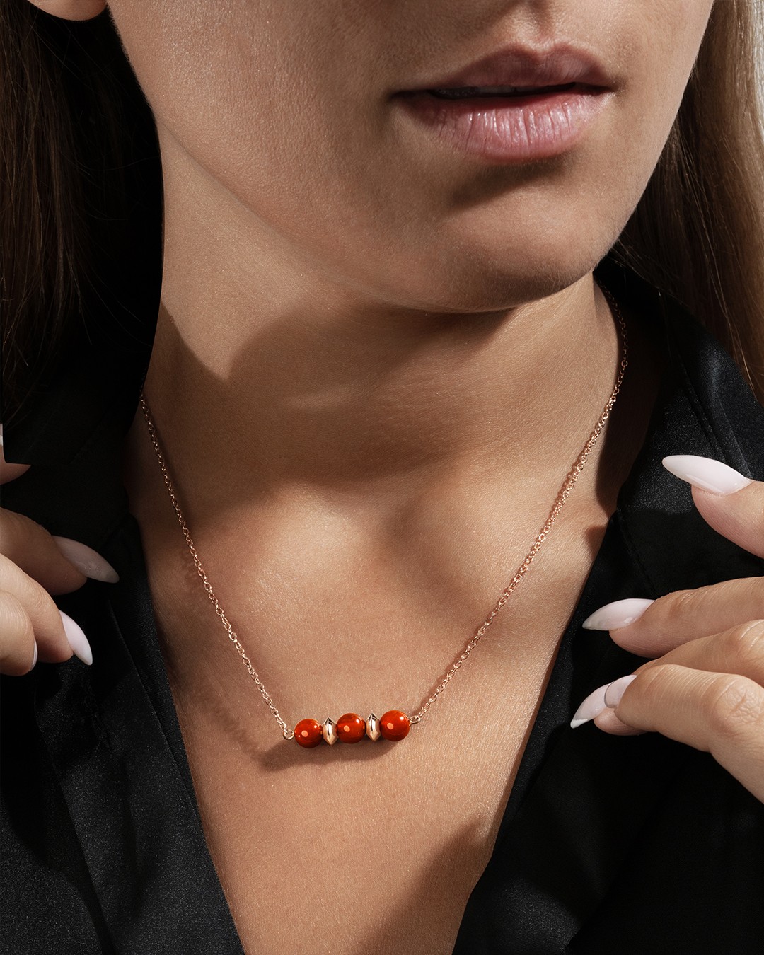 Der Anhänger Perrugina besteht aus 3 tollen Karneol Natursteinen, die sorgfältig zwischen zwei Pastillen aus rosévergoldeten Edelstahl