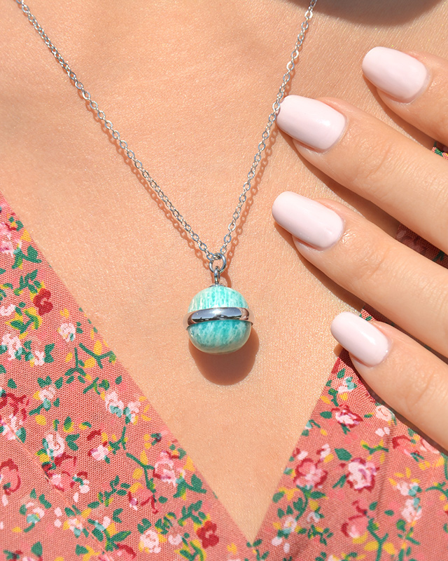 Der Anhänger Picarellio und seine Kette heben den edlen azurblauen Amazonit mit weißen Farb Einsätzen charmant hervor.