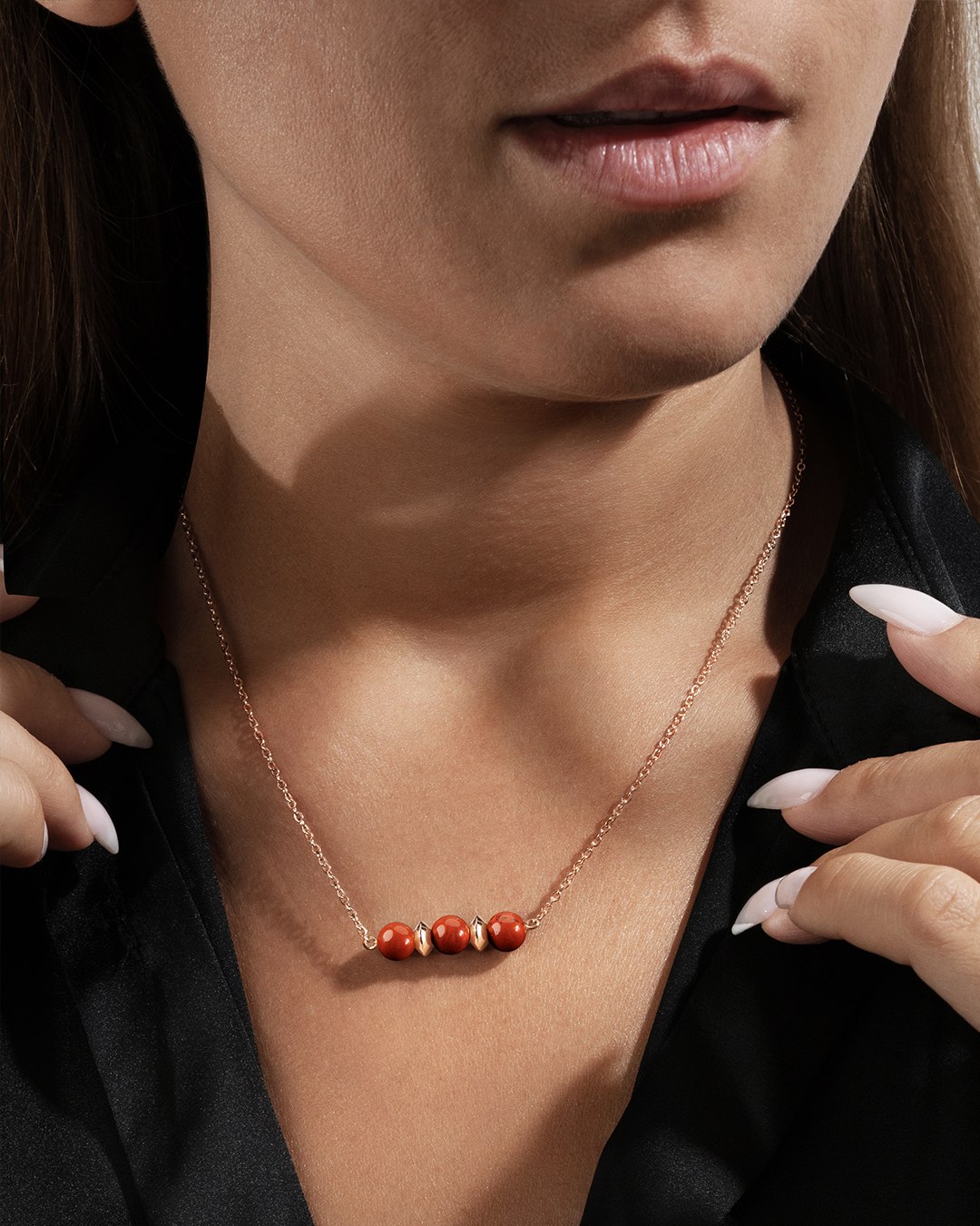 Der Anhänger Spoletina besteht aus 3 roten Jaspis Natursteinen, die sorgfältig zwischen zwei Pastillen aus Edelstahl