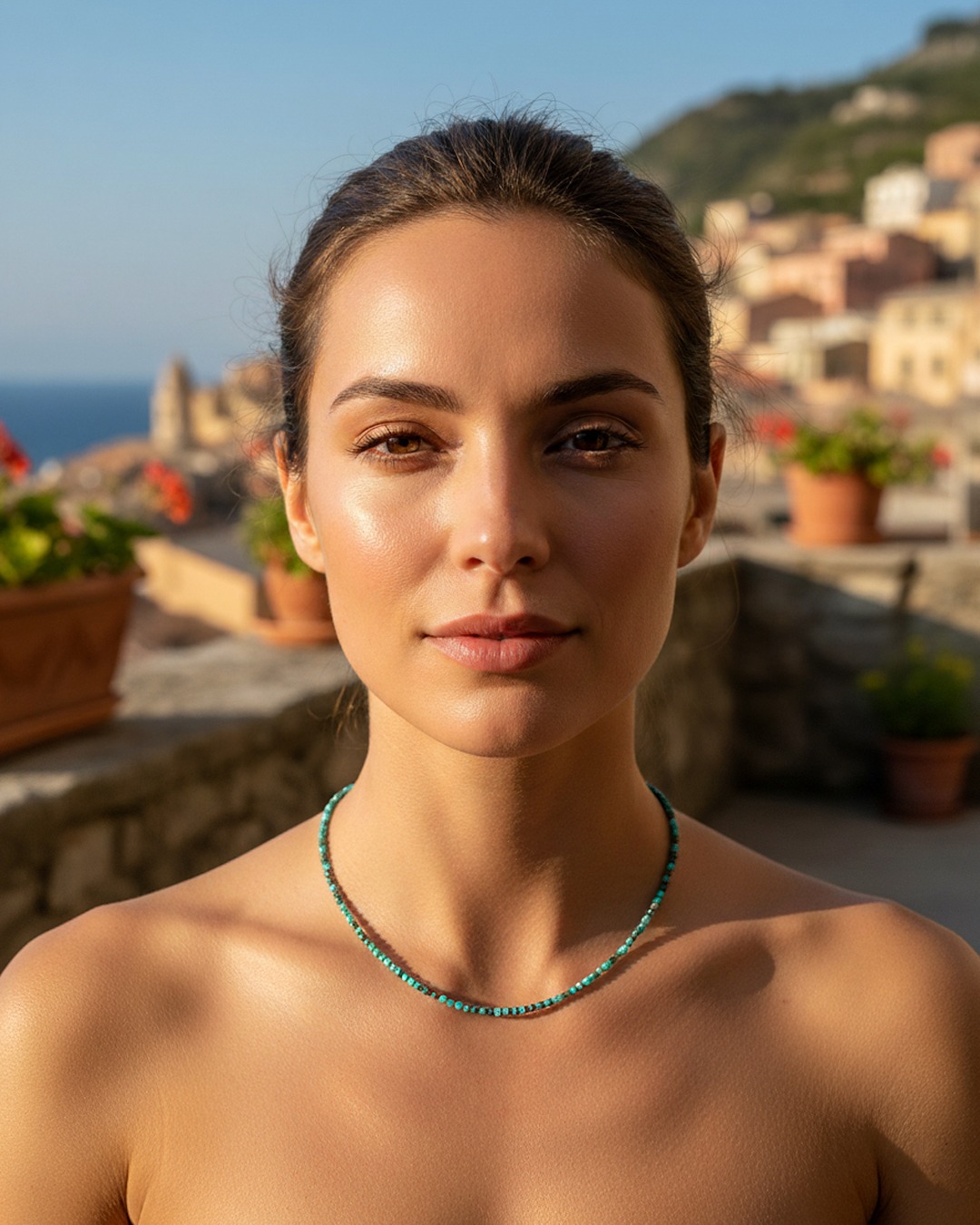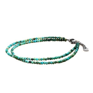 Die Halskette Atrana hebt ein zartes Choker-Design hervor, das aus feinen facettierten Türkis-Perlen von 2 mm besteht.