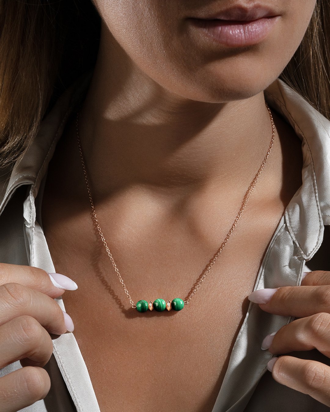 Der Anhänger besteht aus 3 Malachit Natursteinen, die sorgfältig zwischen zwei Pastillen aus roséfarbenen Edelstahl