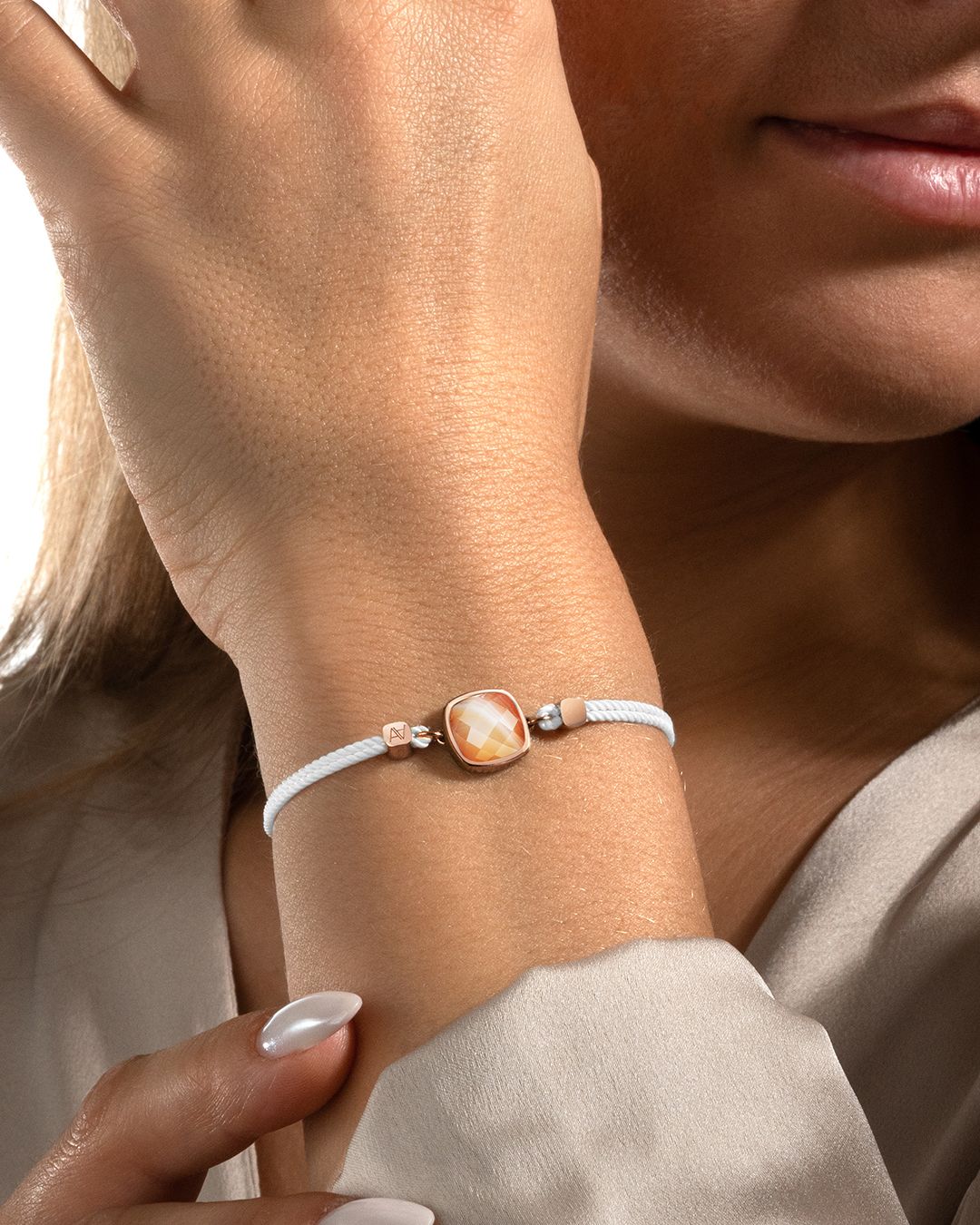 Das Armband Avellinetta Claro ist aus roségoldenem Edelstahl gefertigt, geschmückt mit einem zauberhaften Botswana-Achat.