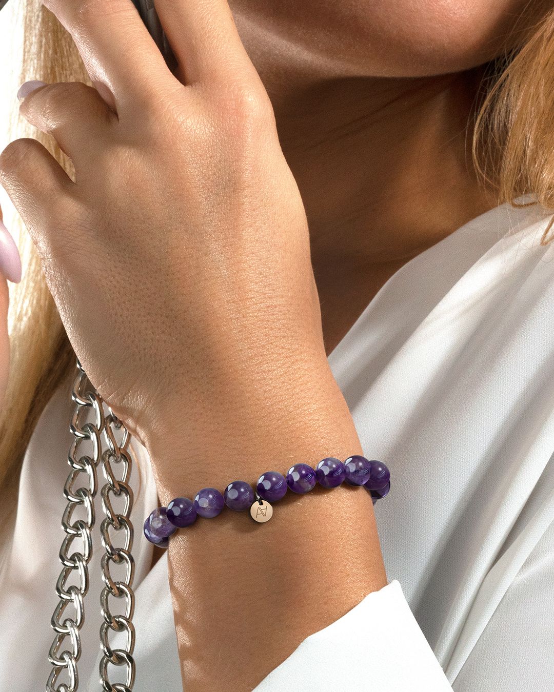 - Material des Armbandes Roséfarbener Edelstahl und amethyst