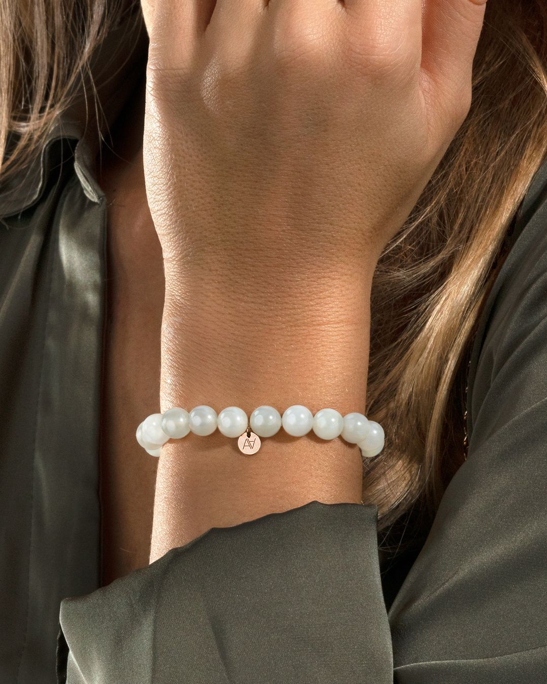 - Material des Armbandes Roséfarbener Edelstahl und beiger mondstein