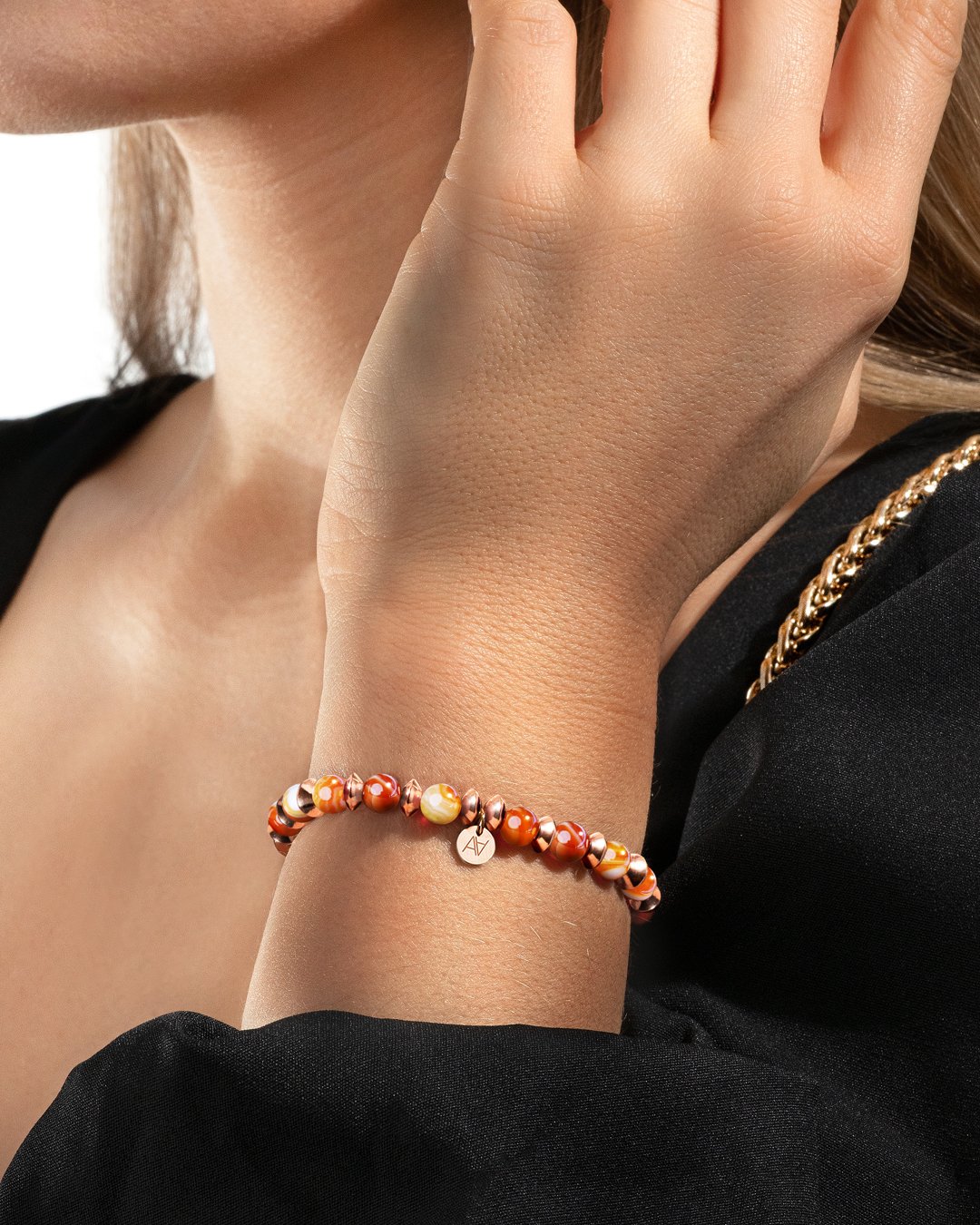 - Material des Armbandes Rosefarbener Edelstahl und gebundenem Achat